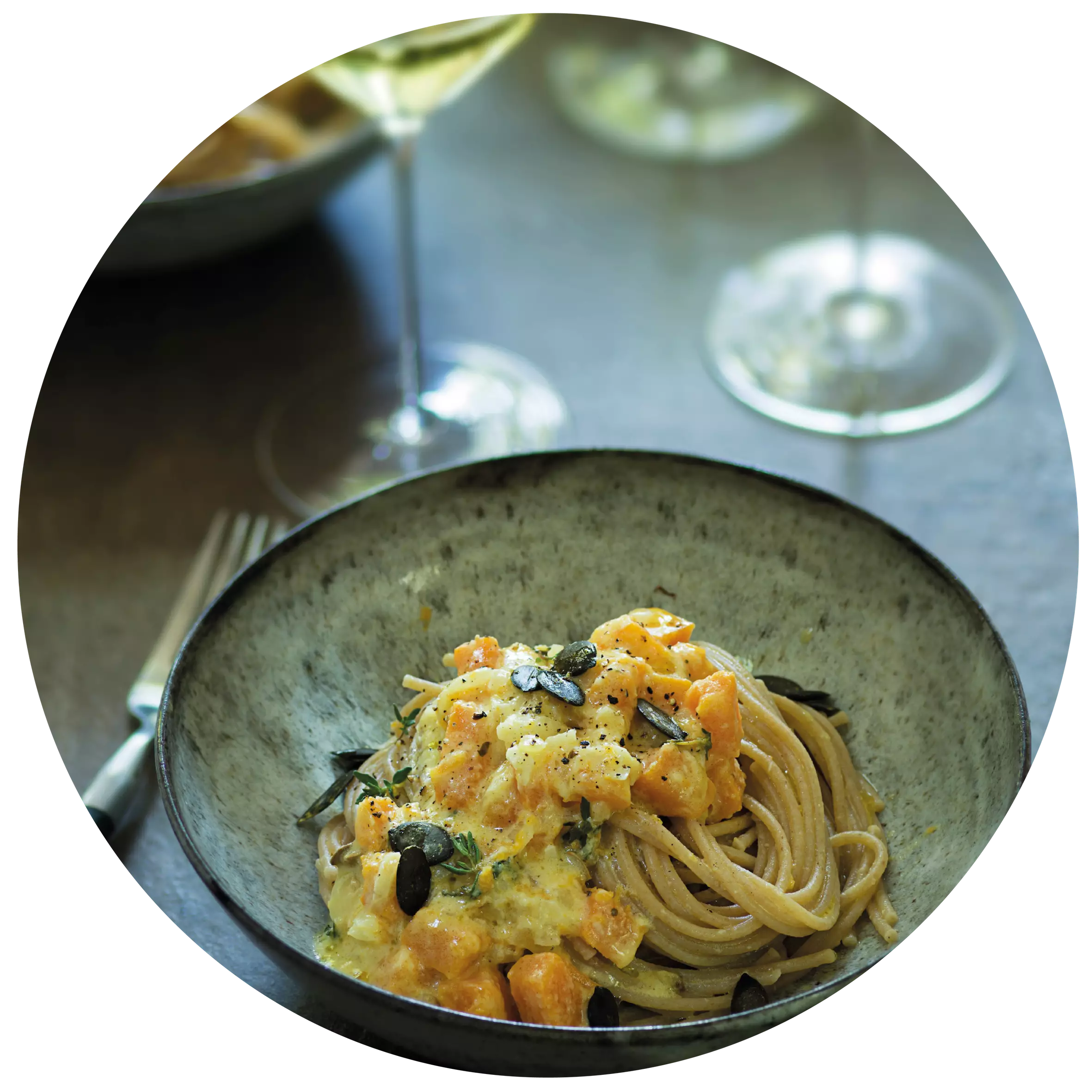 Kurpitsasta syntyy pehmeän hedelmäinen kastike pastalle. Ranskankerma, valkoviini ja parmesaani tuovat täyteläisyyttä - kurpitsansiemenet rapean viimeistelyn.