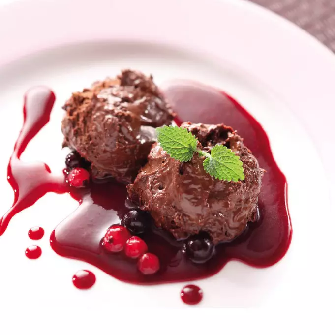 Jälkiruoka Spätburgunderin kanssa Tumma suklaamousse marjojen kanssa