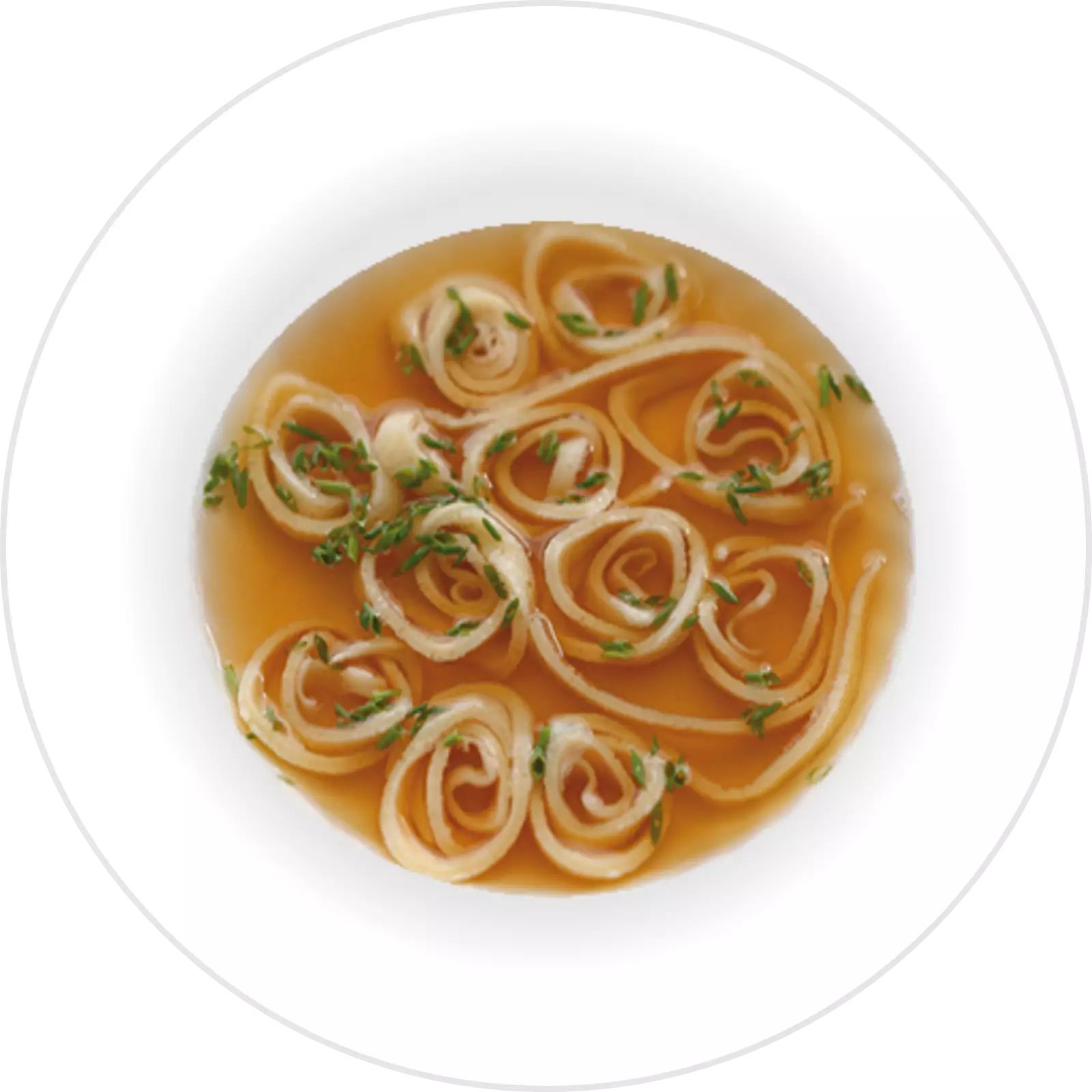Flädlesuppe on saksalainen kirkas keitto, johon lisätään ohueksi suikaloituja pannukakkuja ja tuoretta ruohosipulia – kevyt ja perinteinen alkuruoka.