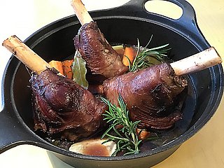 Hauduta kypsiksi 150 asteisessa uunissa noin 3-4 tuntia. Liha on kypsää ja mureaa, kun se irtoaa hyvin luista. Valele liemen yläpuolelle jääneitä potkanosia välillä ja käännä potkat kerran tai pari kypsennyksen aikana. Tarkista myös suolan ja pippurin määrä ja lisää tarvittaessa.