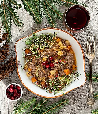 Kun sienet ovat kypsiä ja liha mureaa, nosta hirvipatapata pöytään tekeytymään vartiksi. Tarjoa karpaloiden ja keitettyjen perunoiden kanssa.
