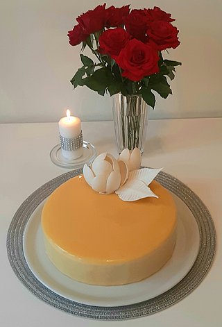 14. Tämän jälkeen kaada mirror glaze seos kakun päälle keskeltä aloittaen. Anna jähmettyä muutama minuutti.