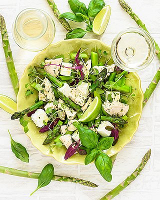 Kasaa salaatti tarjolle kerroksittain kaada loput vinegretestä parsasalaatin päälle.