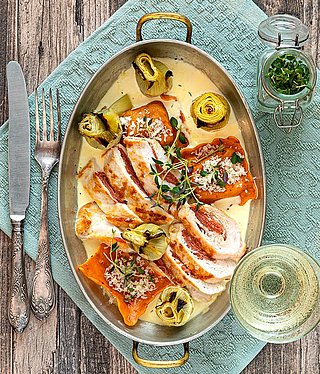 Maustemakkaralla täytetty jyväbroilerin rintafile,