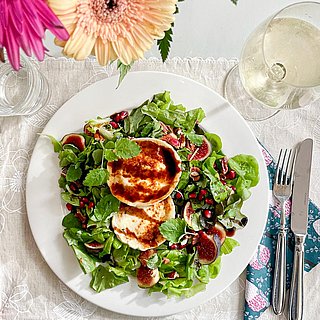 Leikkaa viikunoista lohkoja/paloja. Poista granaattiomenan siemenet. Pese ja revi salaatti sopivan kokoiseksi.