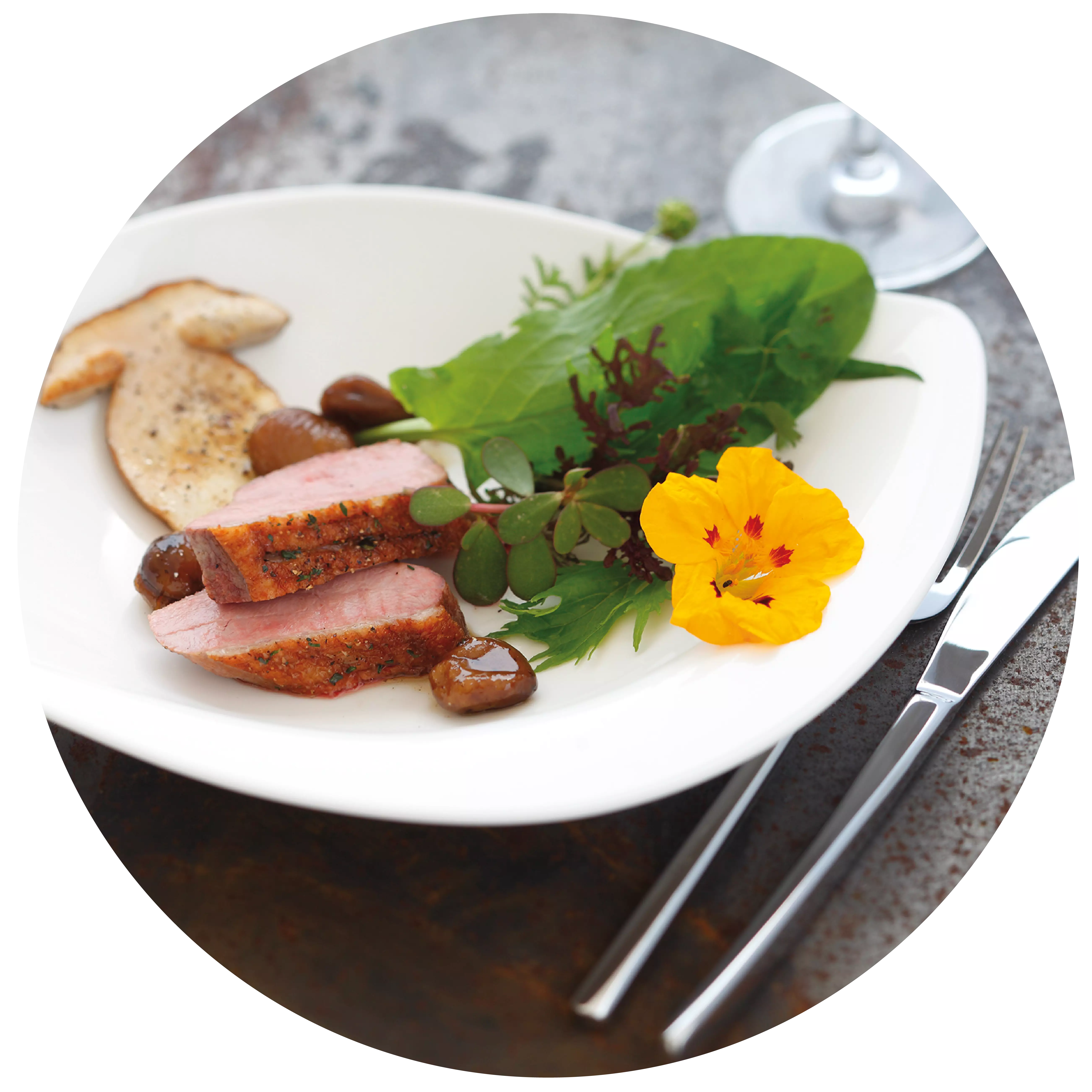 med villandbryst, porcini sopp og glaserte kastanjer Urtesalat