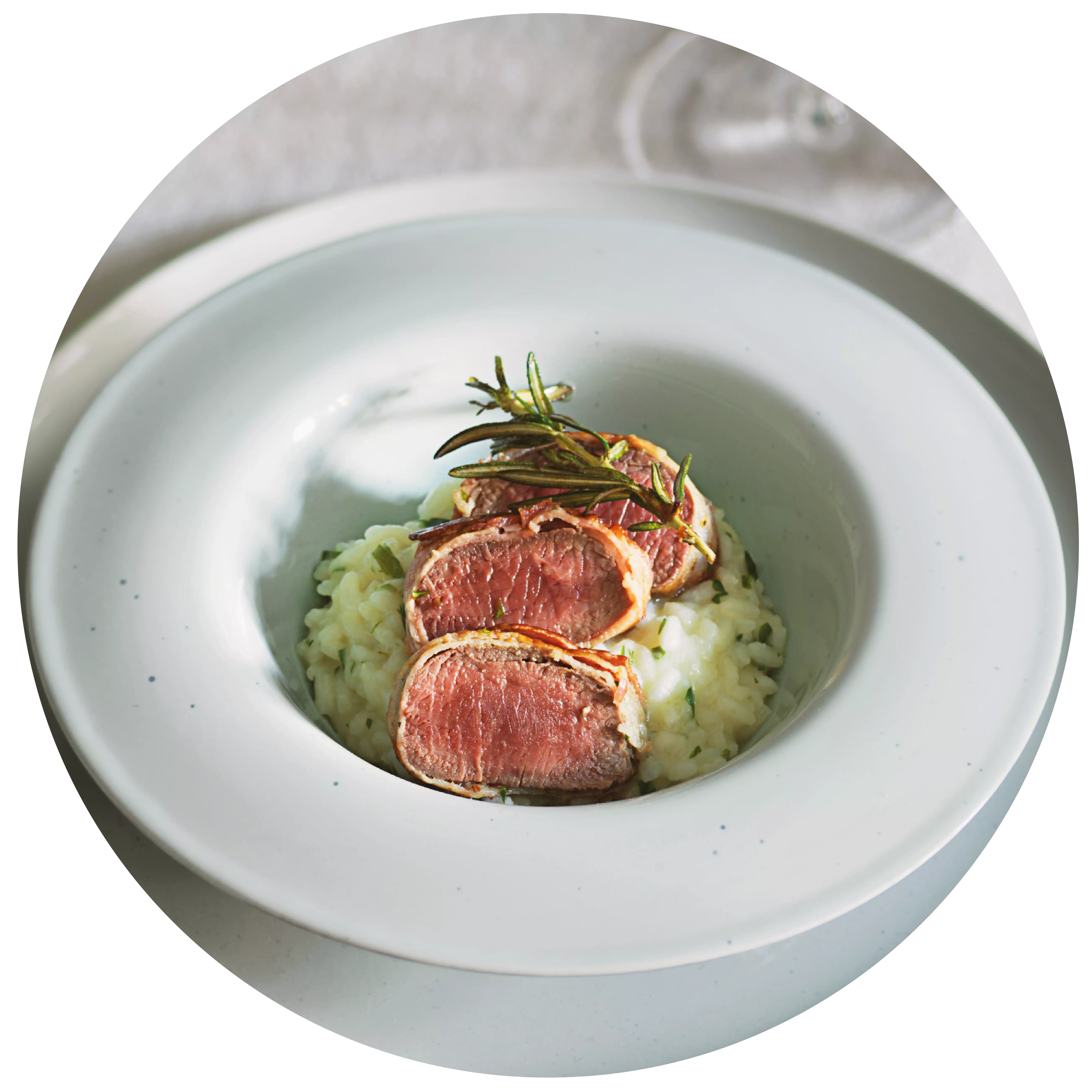 Pakk kjøttet inn i baconskivene og stek det på alle sider i resten av olivenoljen. Stek videre i ca. 4 minutter på hver side på svak varme (steketiden avhenger av tykkelsen på lammelåret - det er best å gjøre en trykktest). Pakk deretter inn i aluminiumsfolie og la dem hvile i ovnen ved 80 °C, slik at de holder seg saftige og litt rosa på innsiden.