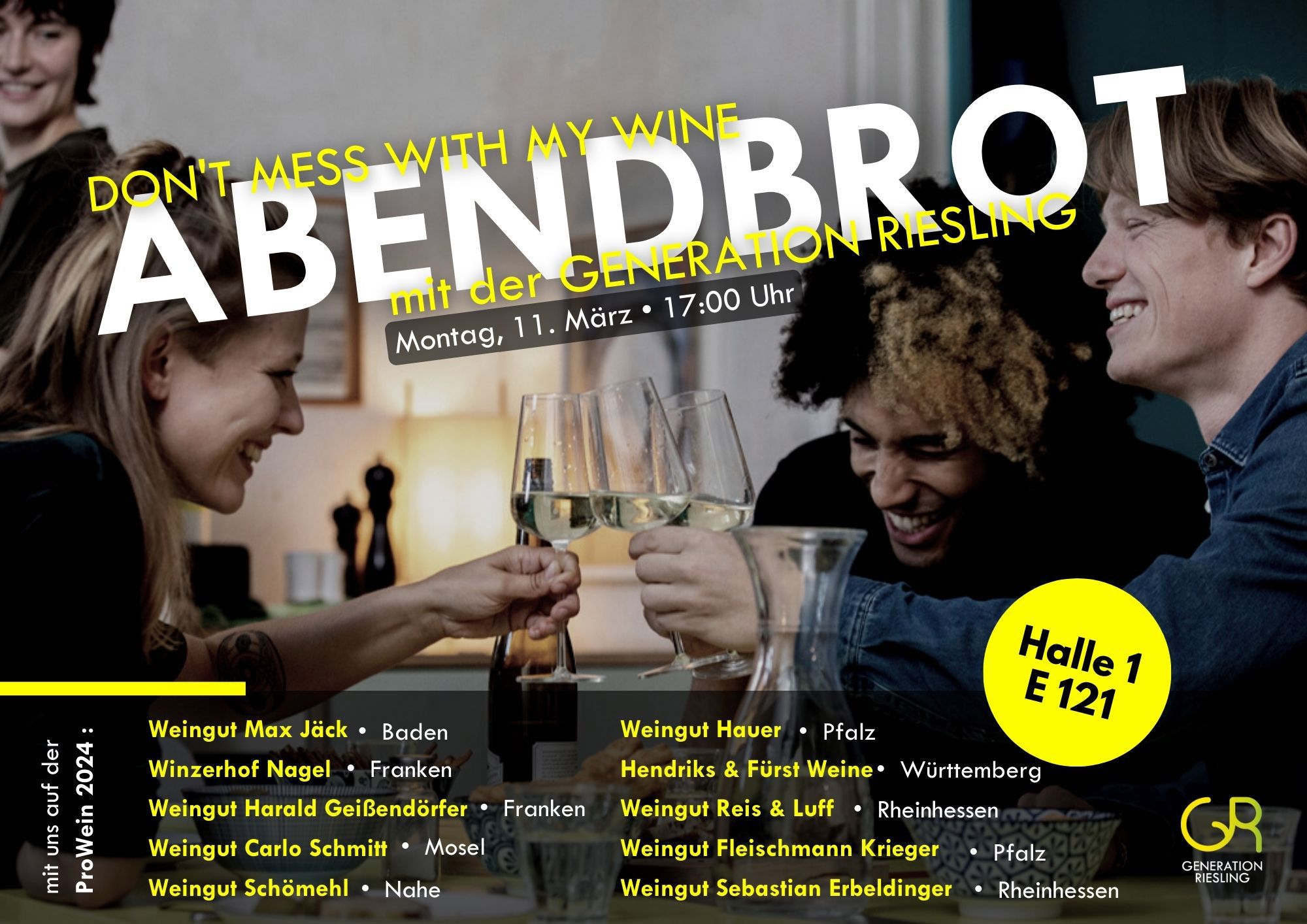 „Don’t mess with my wine“ is the motto on Monday at 5.00 pm, when Generation Riesling invites you to a relaxed end to the fair with an evening meal (German Abendbrot) at the stand.