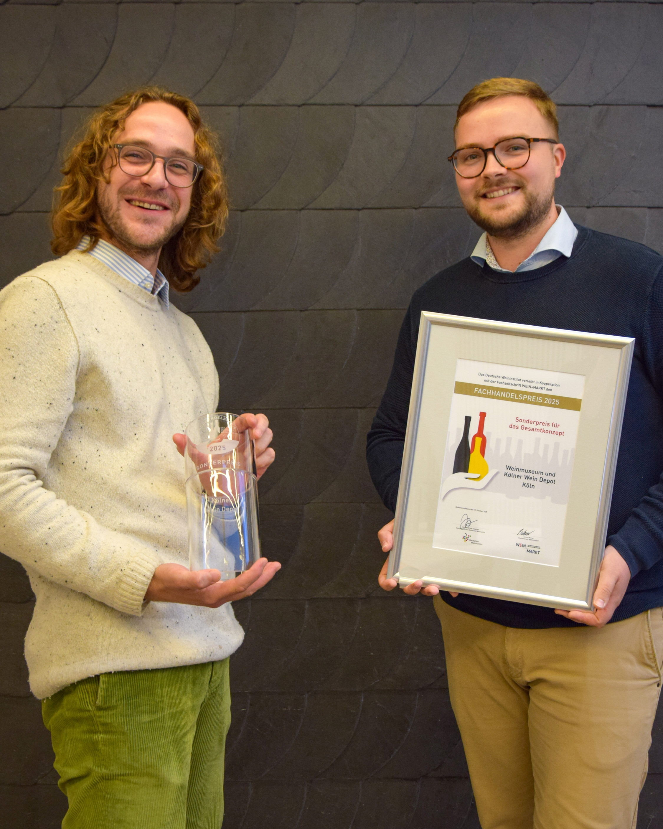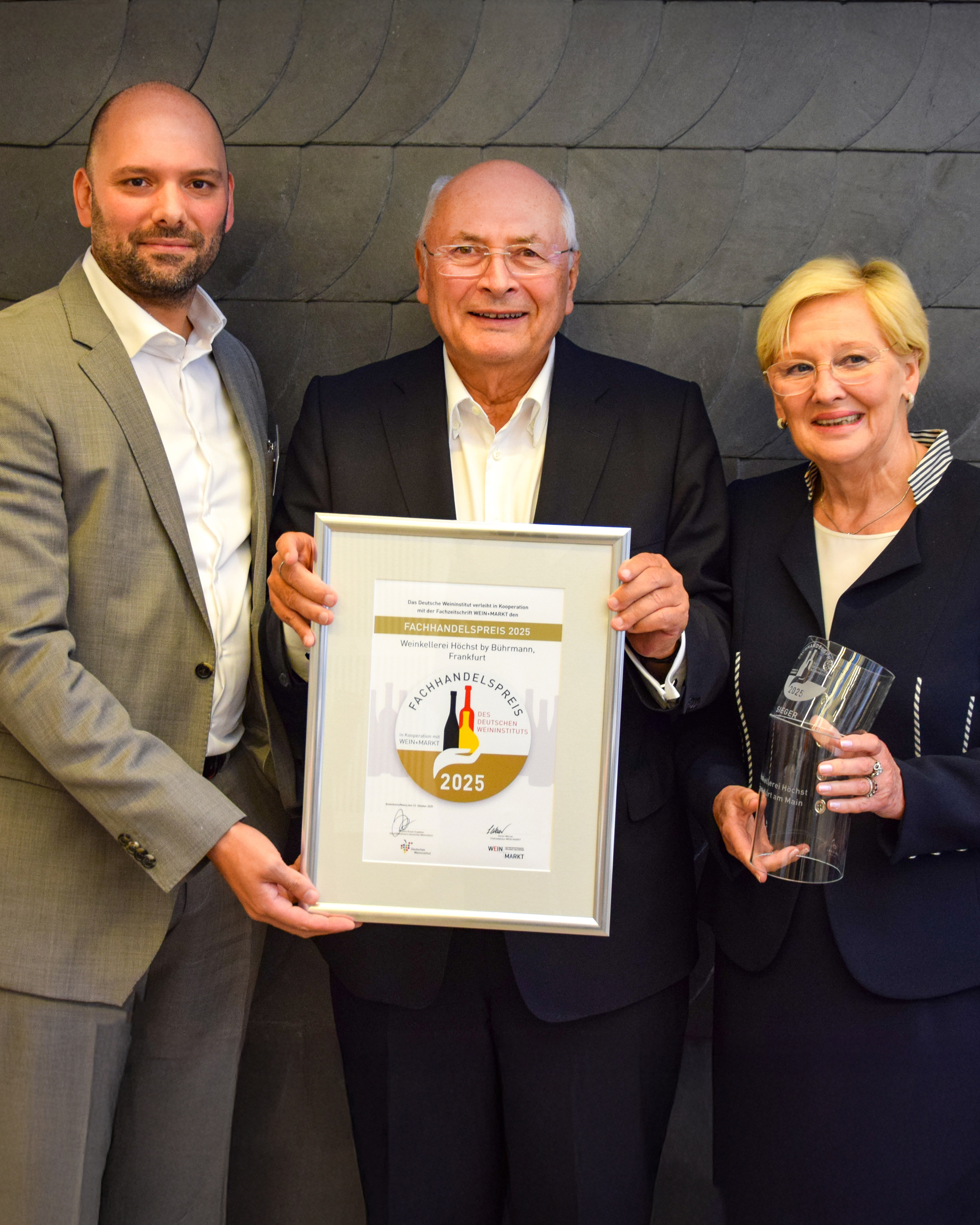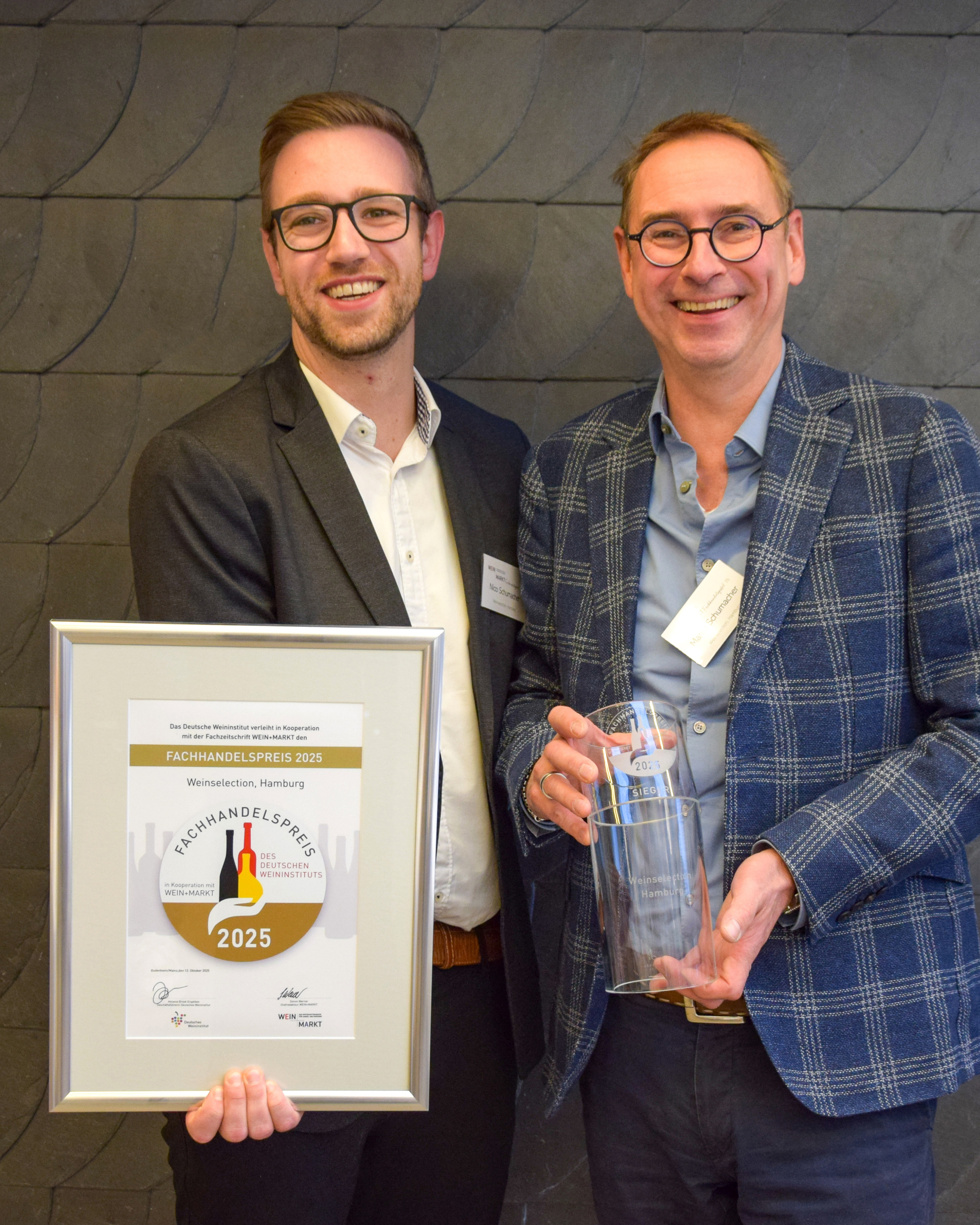 Zu den diesjährigen Preisträgern zählen die Weinkellerei Höchst by Bührmann in Frankfurt-Höchst, das Weinrefugium in Heidelberg und das Traditionshaus Weinselection Hamburg. Mit dem Sonderpreis für das beste „Gesamtkonzept“ wurde das Kölner Wein Depot und Weinmuseum ausgezeichnet.