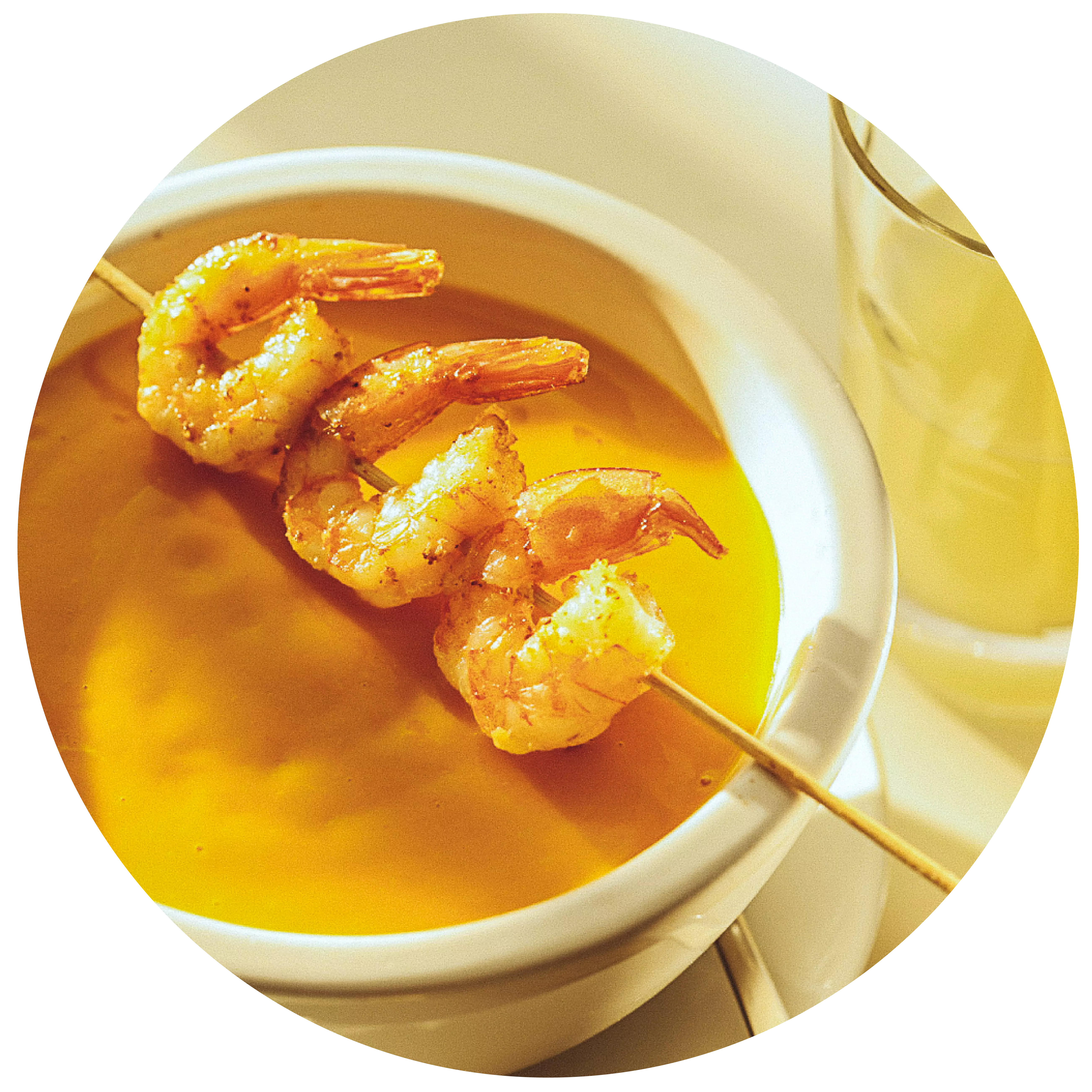 Die Suppe in großen Tassen anrichten und mit den Shrimps-Spießen garnieren.
